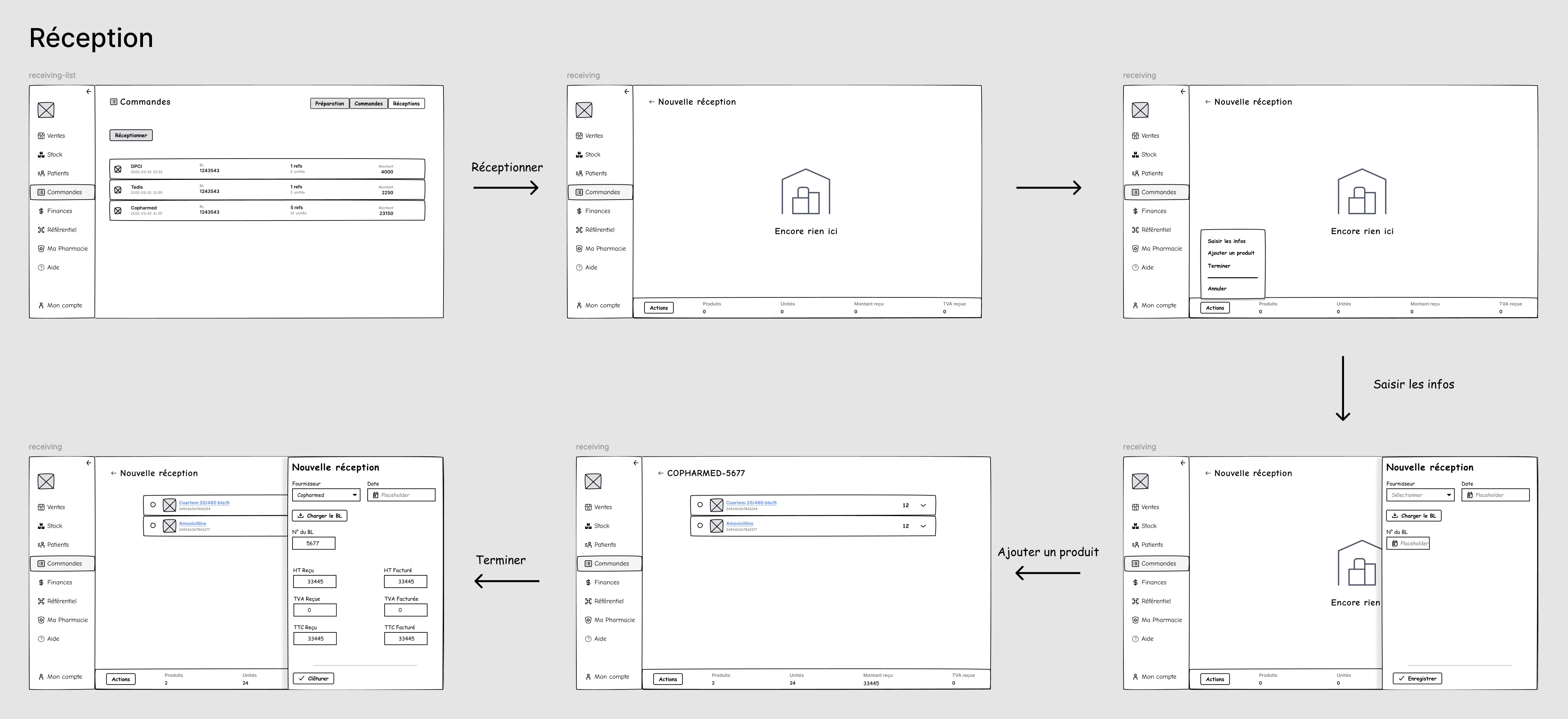 Un des sous-modules de l'ERP de pharmacie, pour réceptionner les produits commandés.