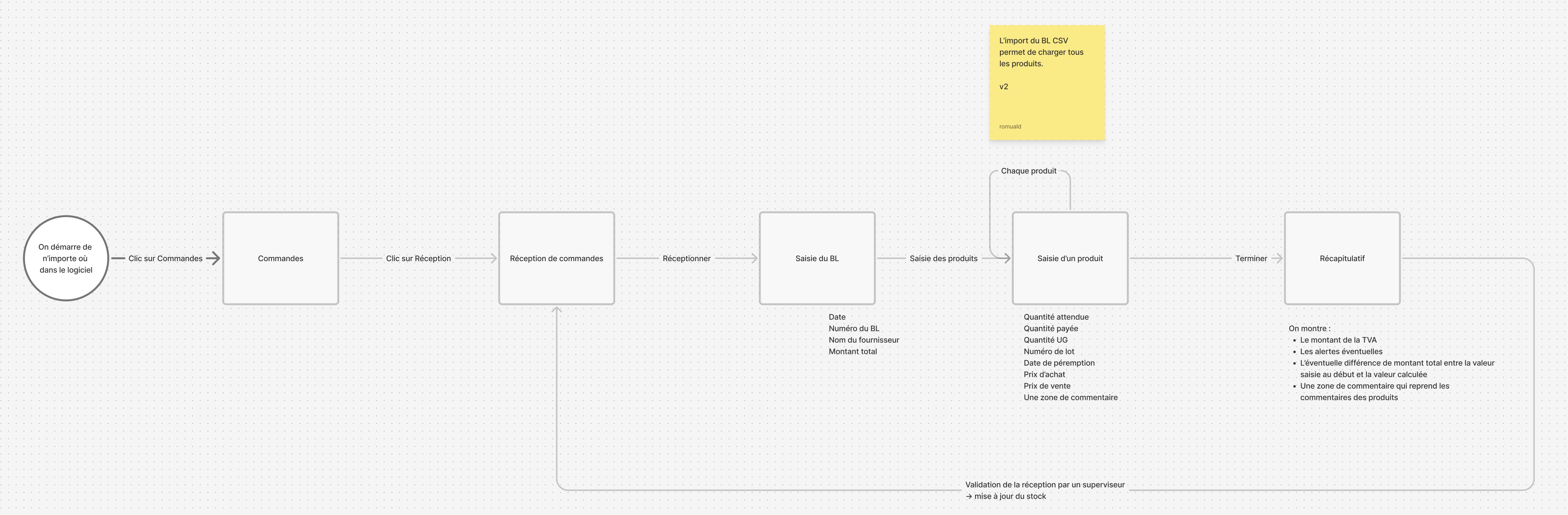 Nous commençons la conception du MVP en priorisant les fonctionnalités core (réceptionner les produits pour mettre à jour le stock, et tout ce qui touche à la gestion financière) et en réservant les autres pour des itérations ultérieures.