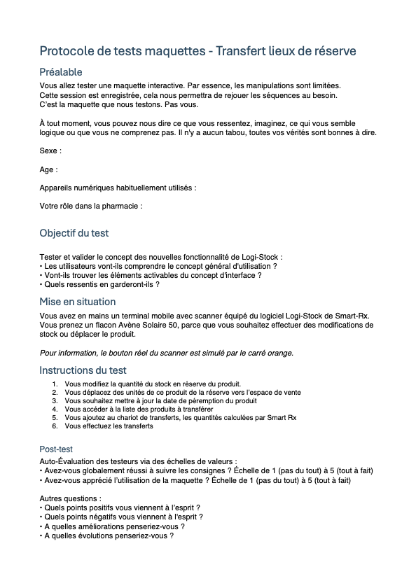 J'ai rédigé un protocole de test que nous avons déroulé auprès de 4 pharmaciens potentiellement intéressés par l'application.